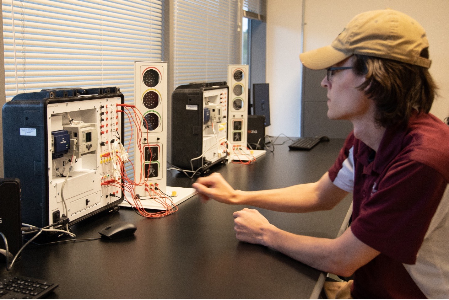 The lab has seven workstations with complete training modules for electro-mechanical systems. Each workstation includes Festo equipment with LVDAC-EMS software. A hybrid-energy module consists of a solar/wind energy training system. The dissectible machines are an essential tool of learning which can be re-assembled using stators, rotors, armatures, rheostats, and capacitors as components
