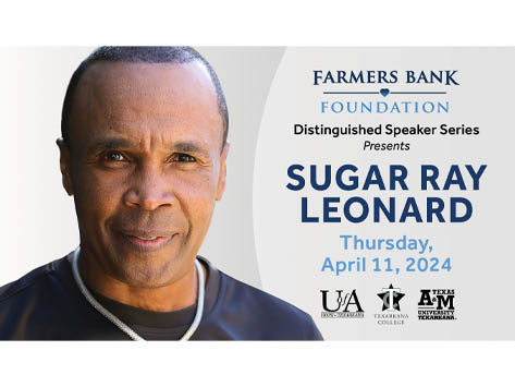 The 2024 Distinguished Speaker Series event will kick off at 5:00pm on Thursday April 11th with a private cocktail reception to meet Sugar Ray Leonard at Farmers Bank & Trust, 2900 St. Michael Drive in Texarkana, TX. The dinner and lecture portion of the event will take place at 7:00pm at The Hilton Garden Inn Texarkana Convention Center, 2910 South Cowhorn Creek Loop, Texarkana Texas.