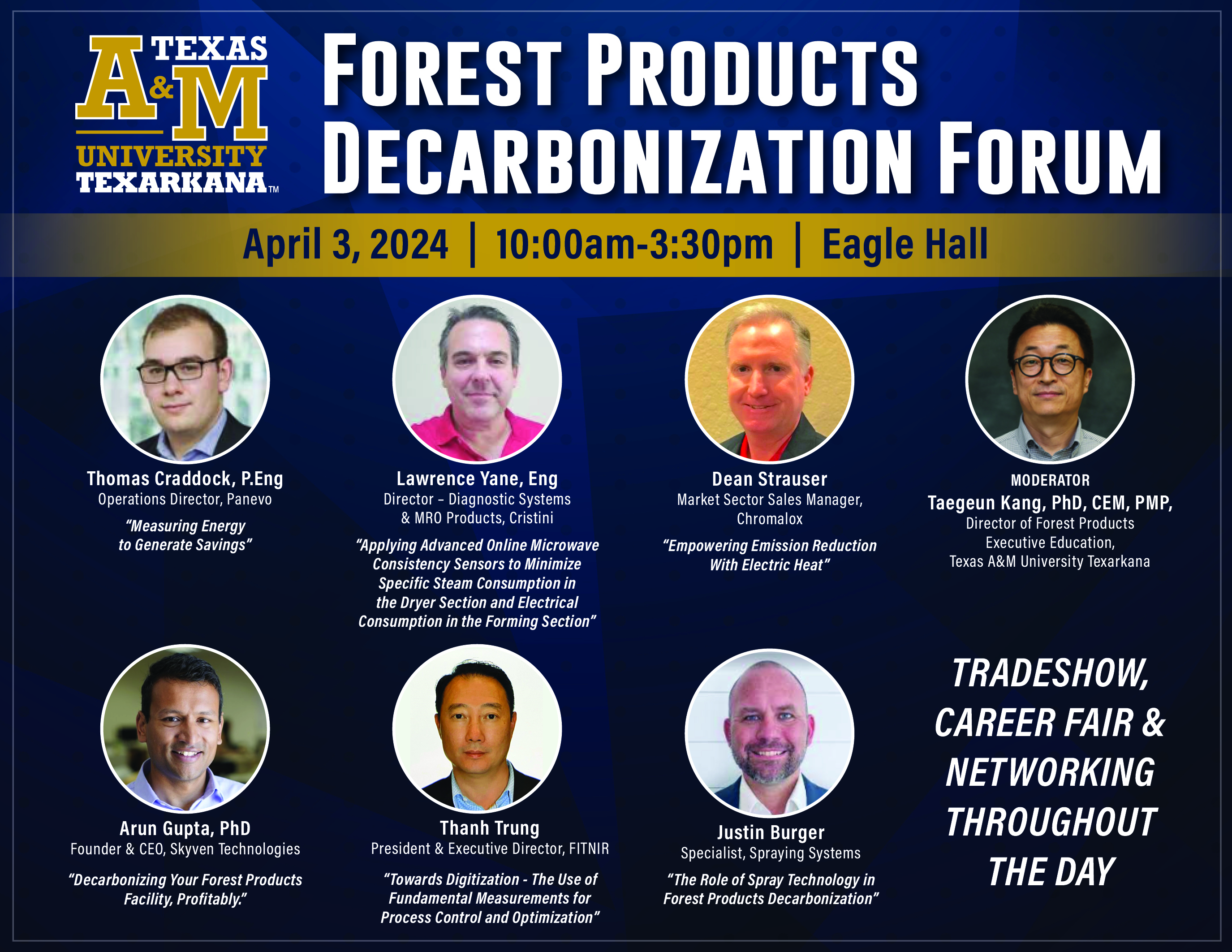 For more information on the Forest Products Decarbonization Forum, please contact Dr. Taegeun Kang, Lecturer of Engineering & Director of Forest Products Executive Education at Texas A&M University-Texarkana at tkang@tamut.edu. Please pre-register for the event at Forest Products Decarbonization Forum, Career Fair and Trade Expo (office.com) or by contacting Dr. Jennifer Davis at jdavis@tamut.edu.